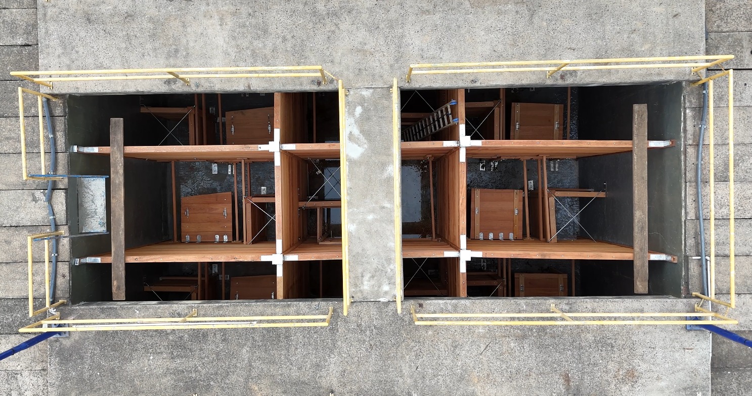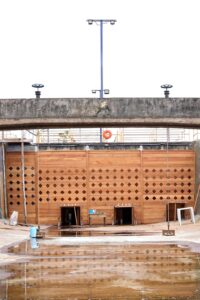 Foi trocado todo o módulo do floculador 2 e as paredes difusoras do floculador 2, e do decantador 1 e 2. A estrutura é de madeira (grápia) e foi impermeabilizada. Além disso, foram reformadas as juntas de dilatação e possíveis trincas na estrutura.